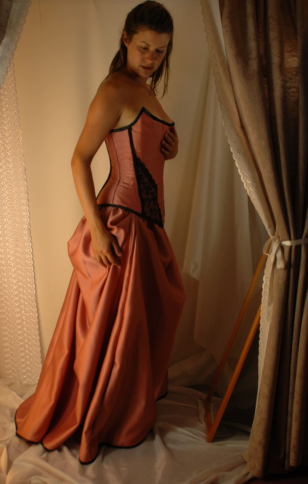 With specialist corsetry materials and a sumptuous dupion satin, this gown, in a classic Edwardian style embellished with black lace and complimented with a co ordinating scoop neck steel boned corset creates an elegant and breath taking ensemble.