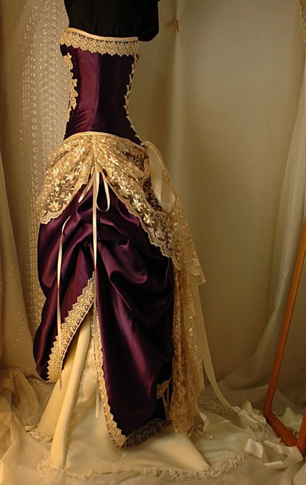 The rich shades and the antique cream coupled with the Cadbury purple’s deep and vibrant tones in a gorgeous, heavy duchess satin creates a sensational gown.